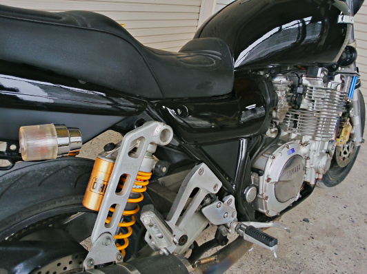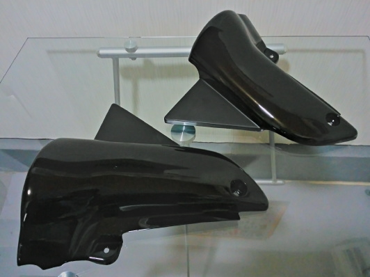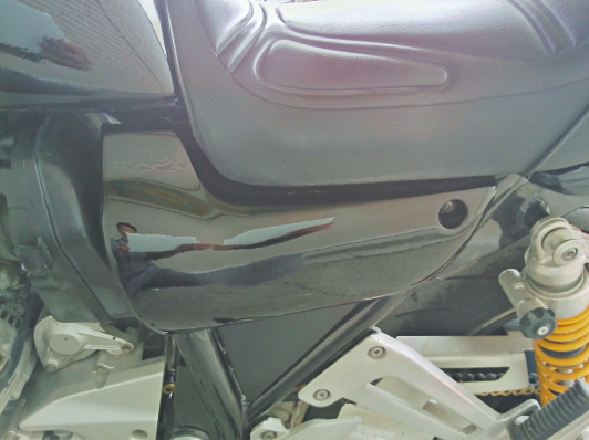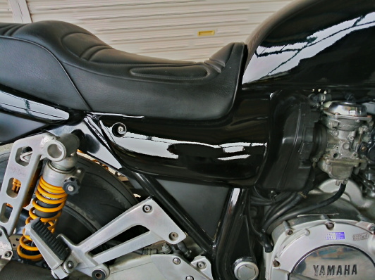 XJR1300 左右セット 純正ブレンボ・サイドカバー取り付けが下ダボ上・後ビスのタイプ専用 黒ゲル(塗装ベース)FRP画像は塗装済み取り付けイメージ 取付は純正サイドカバーと同じです。ノーマル車両に単品での取り付けもできます。