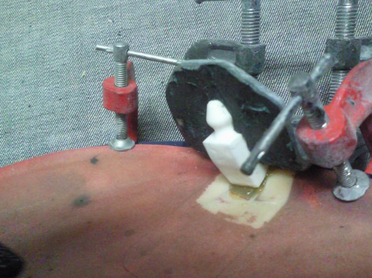 実際の作業は右下画像のように破損したサイドカバーを型にセットしてからゲージにダボをはめて位置を確認します。