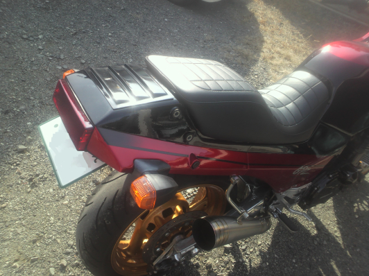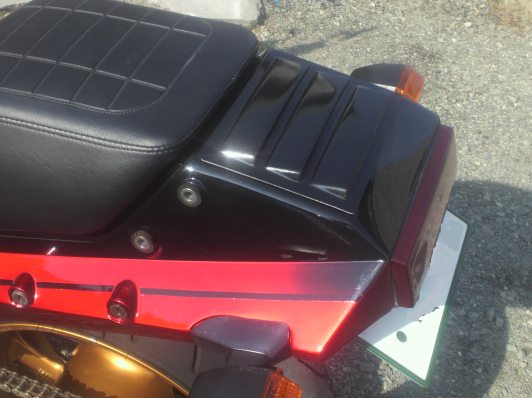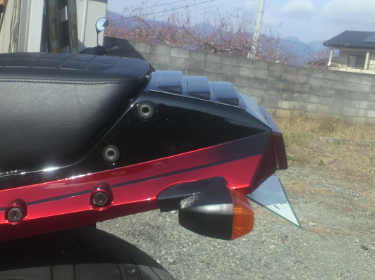 GPZ900R/GPZ750R リアルーバーパネル ¥2728 黒ゲル(画像は塗装済み装着イメージ) 純正テールカウル上に貼り付けるパネルです。 ルーバーの穴は開いていません。 汎用品ではありません。NINJA専用設計の為曲率がぴったりと合います。 リベットなどで固定すればさらにハードはイメージに・・