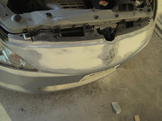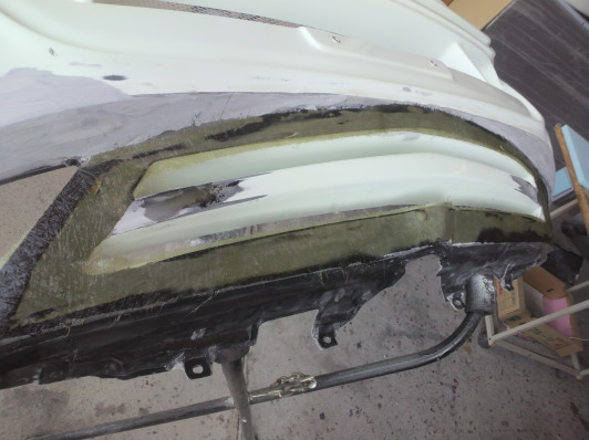 今回は作業終了時、純正バンパーを捨ててしまっていいとのことでしたので後々邪魔になってくるグリル部分を埋めてからの型取りです。