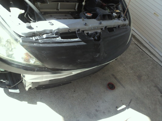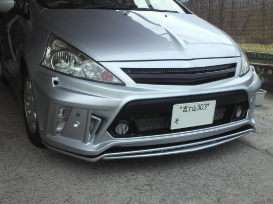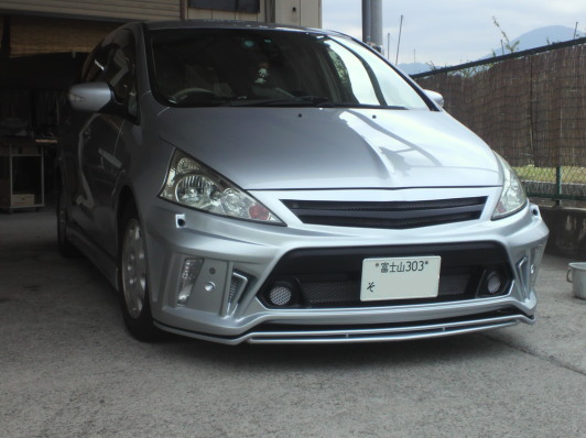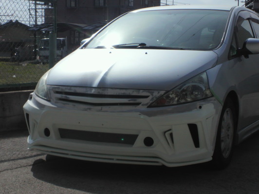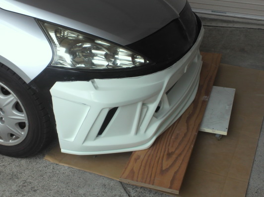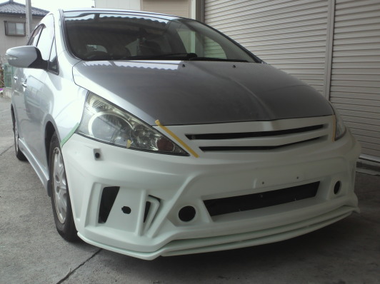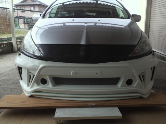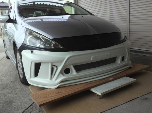ベースとなるプリウスα用エアロが到着です。幅は比較的に近いのですが高さやグリル部分の角度が全く違うのでライト下部分でカット、この段階で地上高を指定の数値にあわせます。