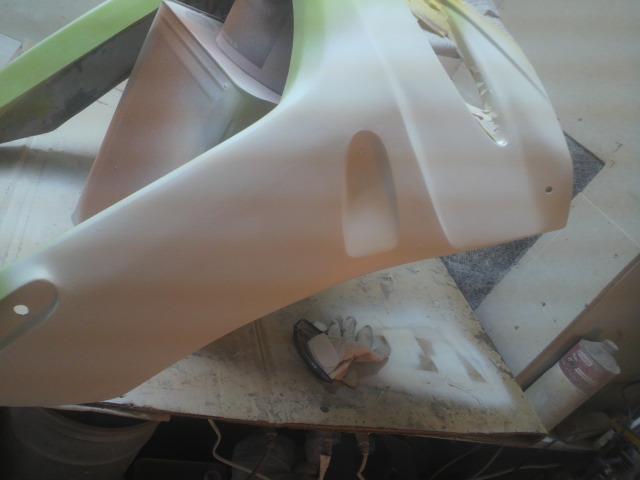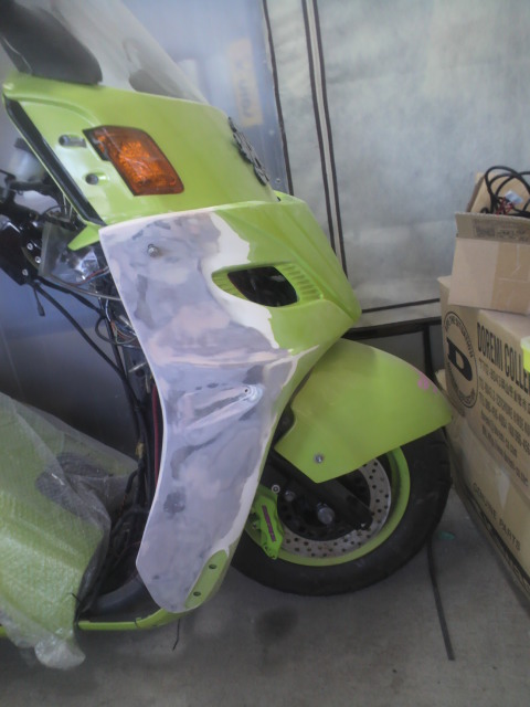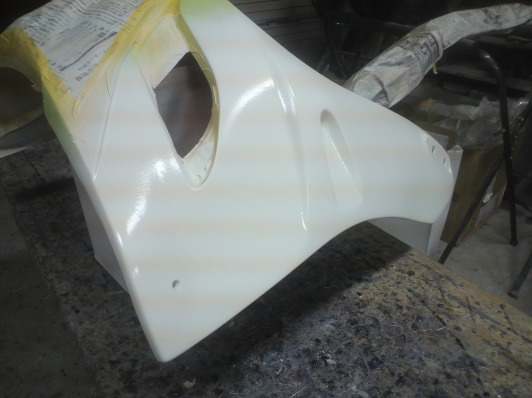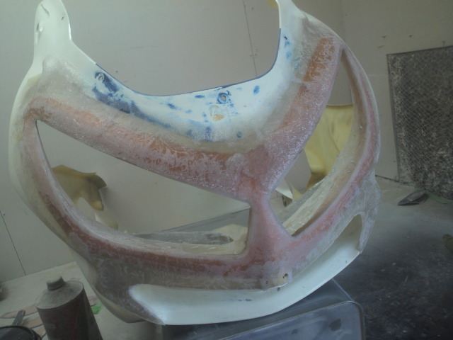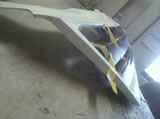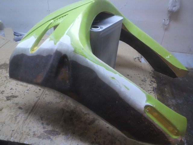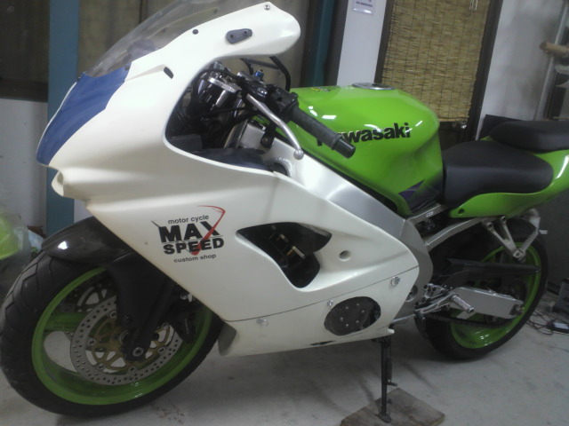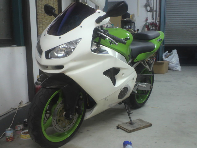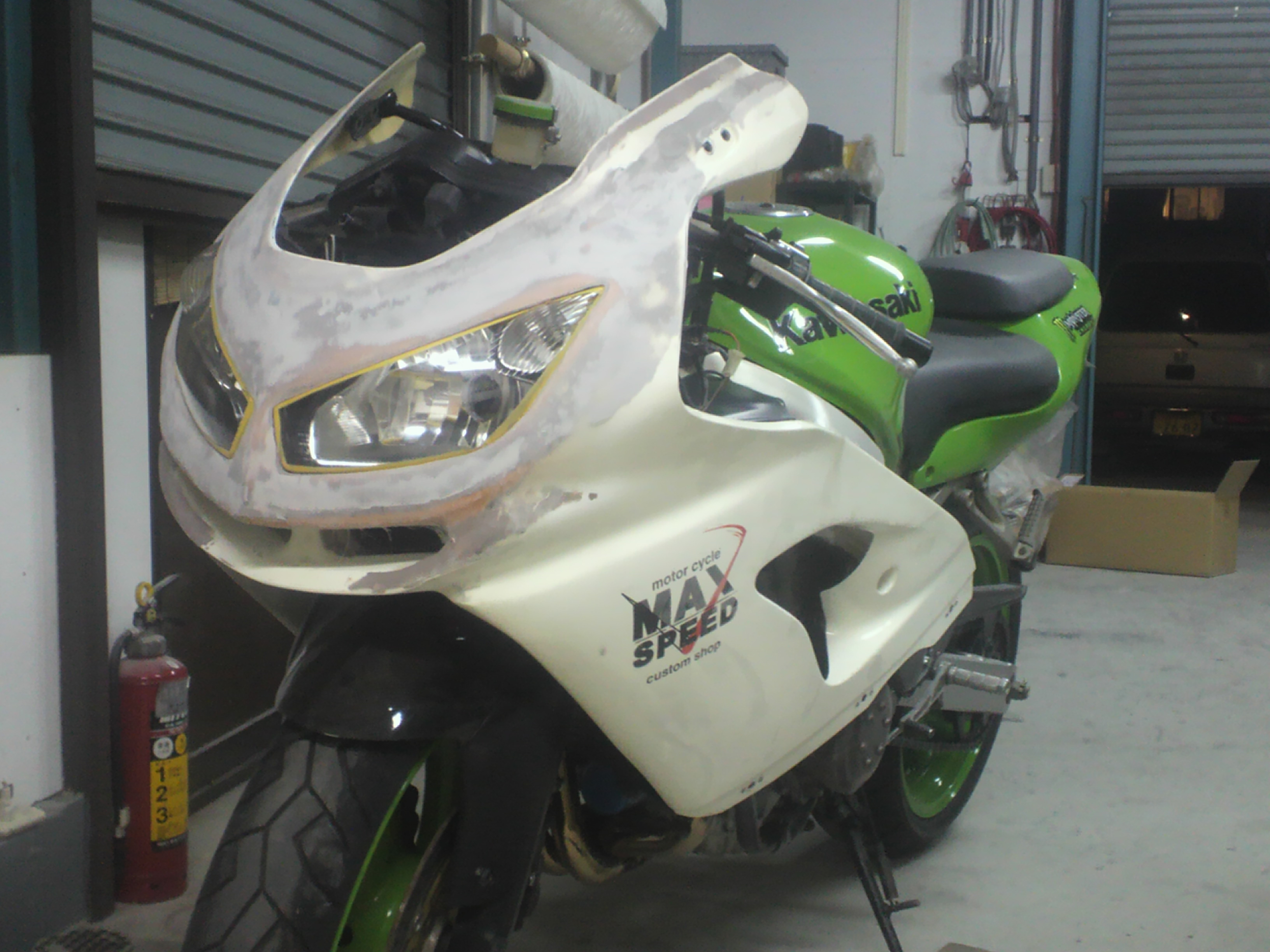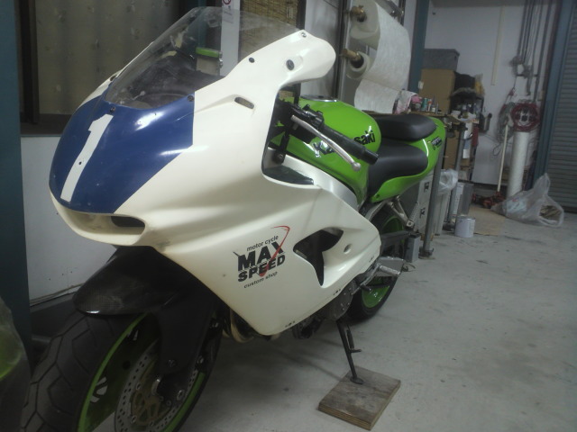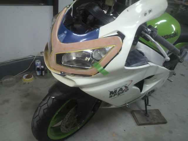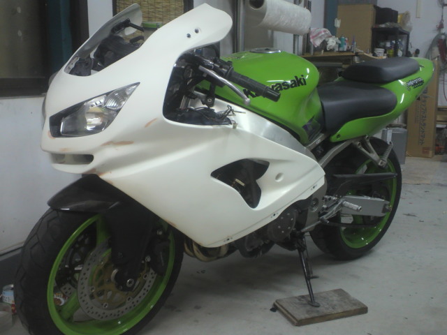 これは自分のZX9Rなんですが、たまたま格安でE型用(現車はC型)のレース用カウルが手に入ったので加工して取り付け中です。
