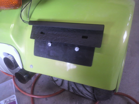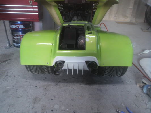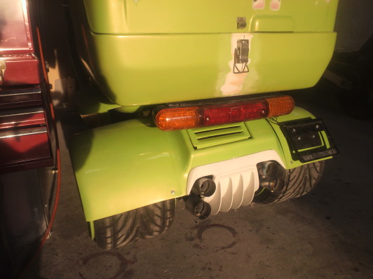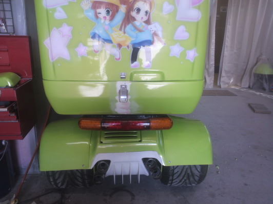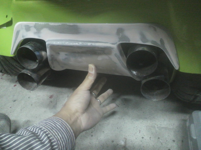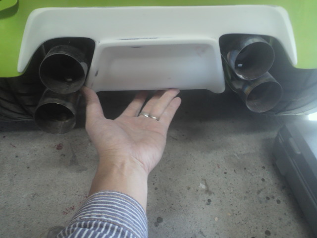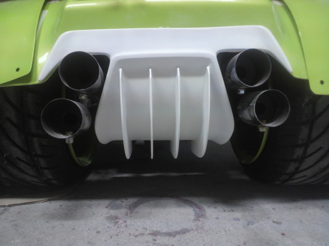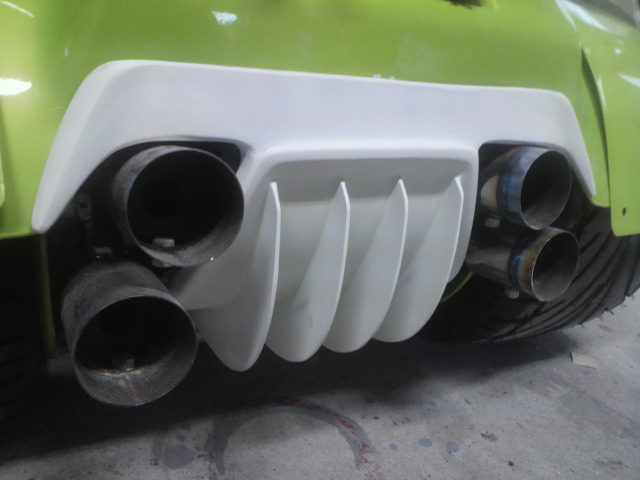 右画像はワンオフのリアディフューザー。マフラー上側の純正マフラー用のカットが左右で違うのでそこも隠れるように上を少し大きめにしてあります。