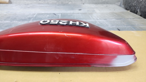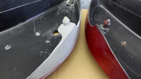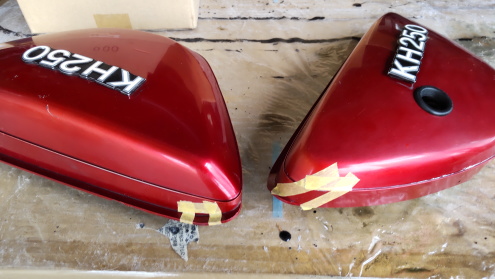 7/10兵庫県N様ご依頼のKH250純正サイドカバーの修理です。下側ダボ周辺はごっそりと無くなっていて取付できない状態でした。