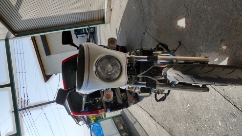 マフラーはモリワキチタンのエキパイにメーカー不明のアクラ風サイレンサーですが、チタン、カーボンということで中古品を購入しました。